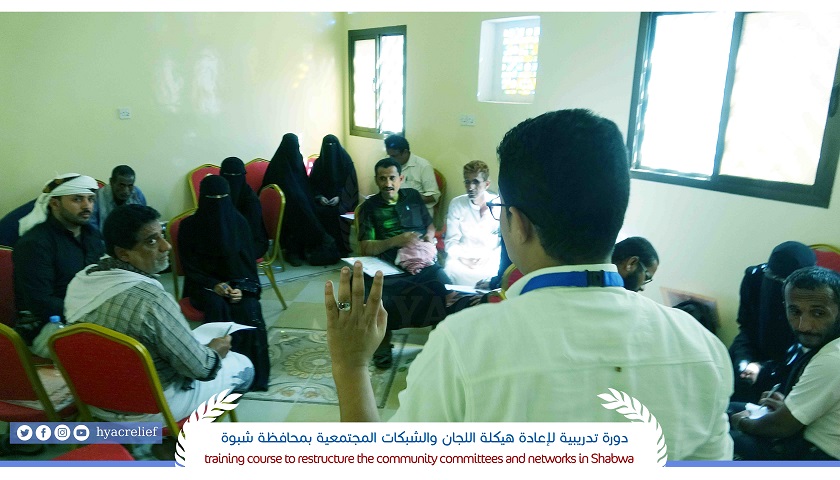 أقامت”HYAC”دورة تدريبية لإعادة هيكلة اللجان والشبكات المجتمعية بمحافظة شبوة لتطوير أداء اللجان المجتمعية في المحافظة ضمن مشروع أمن وحماية المرأة والذي تنفذه HYAC بتمويل من صندوق الأمم المتحدة للسكان ويهدف إلى تقديم المساعدات ورفع مستوى الوعي للفرد والمجتمع وتمكين النساء الضعيفات والمعرضات للخطر والمعنفات ودمجهم في المجتمع حيث تلقى المتدربون شرحاً تفصيلياً لأهم القواعد والأسس في مشروع أمن وحماية المرأة كما تمت مناقشة مهام اللجان وآلية عملها في المديريات والمناطق المتفرقة بالمحافظة.