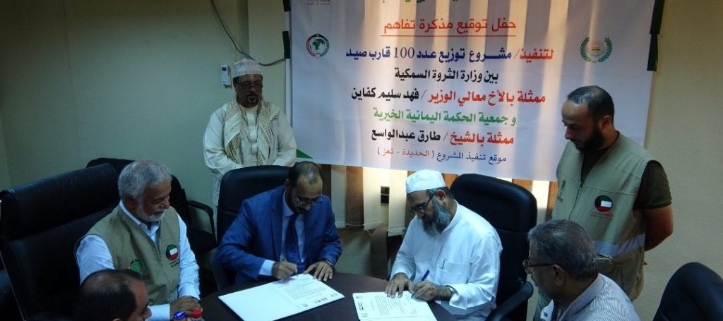 وقعت جمعية الحكمة اليمانية الخيرية مع معالي الاستاذ فهد سليم كفاين وزير الثروة السمكية على مذكرة تفاهم لتوزيع عدد 100 قارب للصيادين في( محافظتي تعز والحديدة ) بمديريتي المخا والخوخة وبمبلغ يزيد على 450 الف دولار بتمويل كريم من دولة الكويت الشقيقة عبر الجمعية الكويتية للإغاثة .