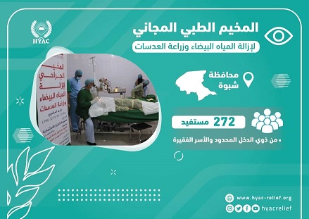 ضمن البرامج الصحية التي تنفذها #HYAC بتمويل من دولة #الكويت🇰🇼 الشقيقة في #اليمن🇾🇪 .. نفذت #HYAC خلال الأسبوع المنصرم المخيم الطبي المجاني لإزالة المياه البيضاء وزراعة العدسات بمحافظة #شبوة ، حيث استفاد من المشروع 272 فرداً من ذوي الدخل المحدود والأسر الفقيرة الذين لايستطيعون السفر لخارج المحافظة لتلقي العلاج .