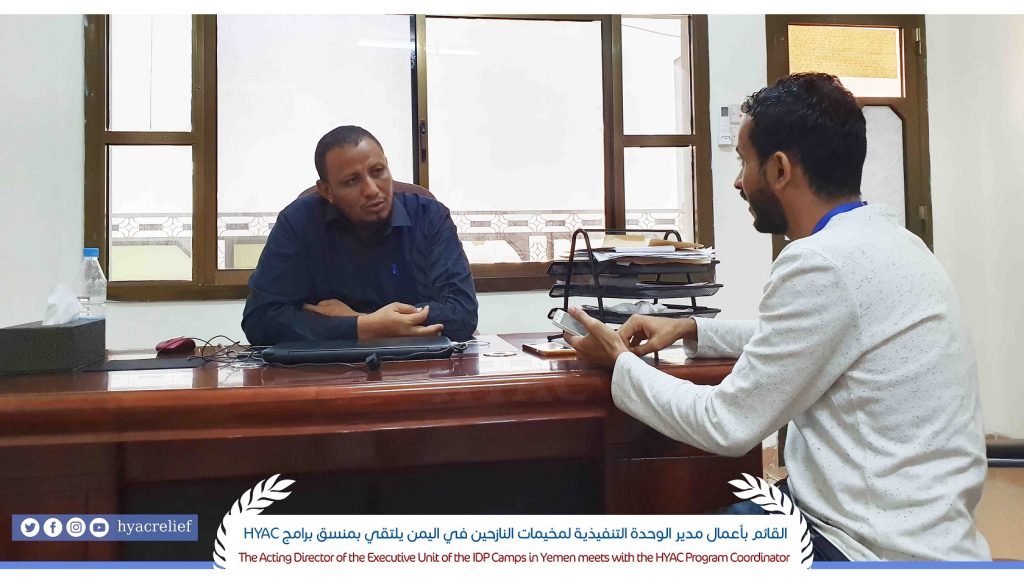 During the meeting, they discussed the conclusion of the project of furnishing the offices of the Executive Unit for IDP camps in Aden, Lahj, Hadramout, Taiz and Hodeidah governorates, which is implemented by HYAC and funded by the United Nations High Commissioner for Refugees (UNHCR).